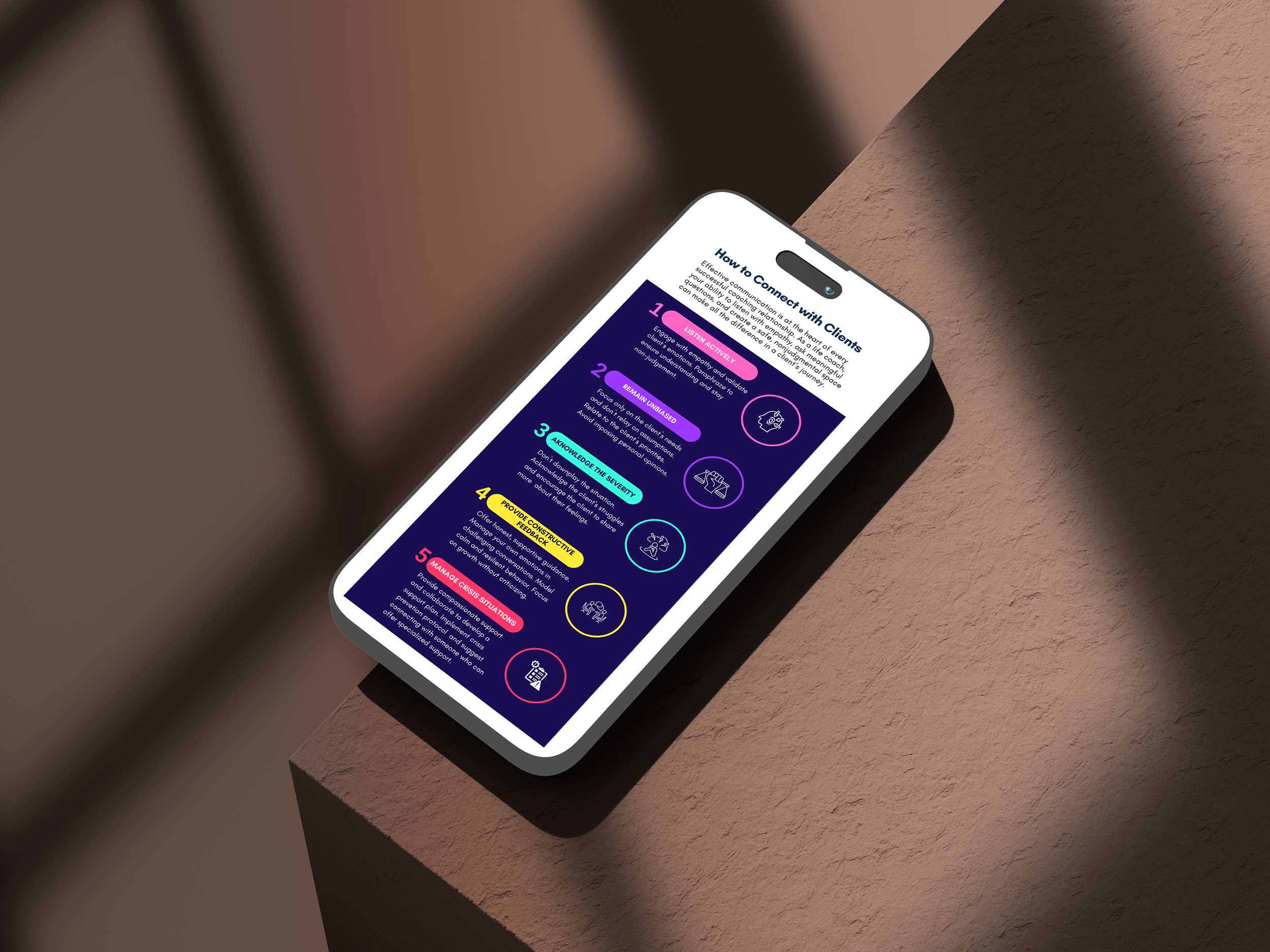 This job aid is designed as an easy-to-access reminder of knowledge the learner has gained throughout a scenario-based eLearning on building strong client communication skills.